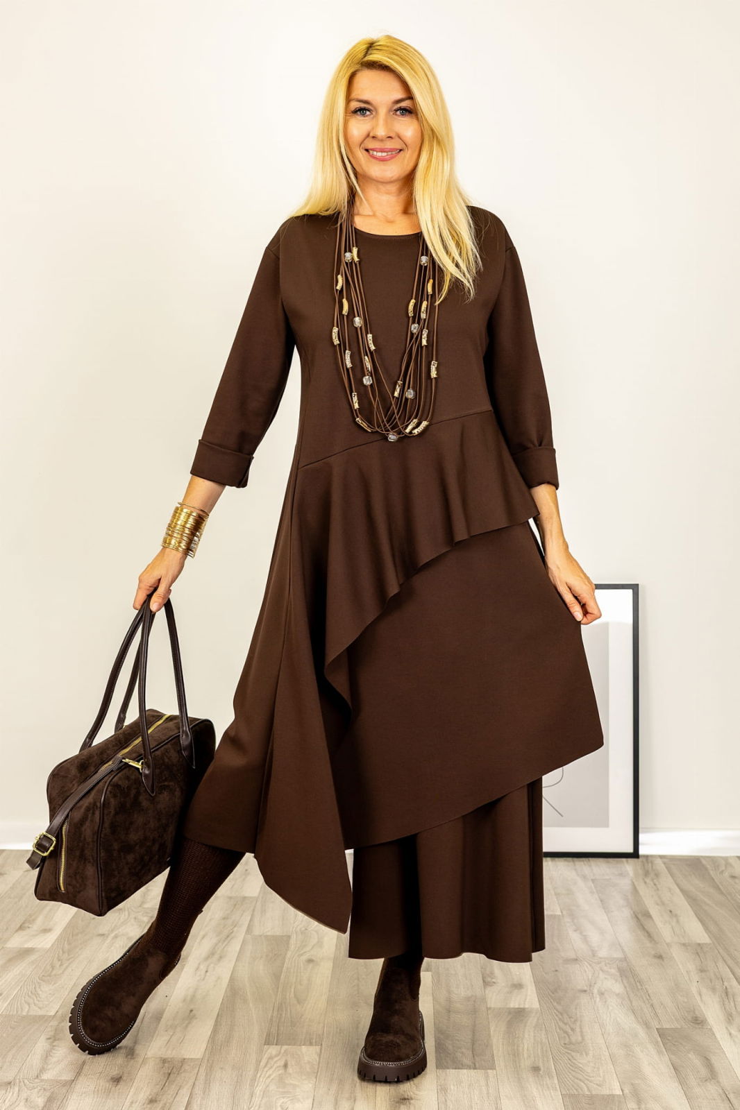 Shopika Rochie maxi asimetrica cu volane, din tricot de vascoza, maro