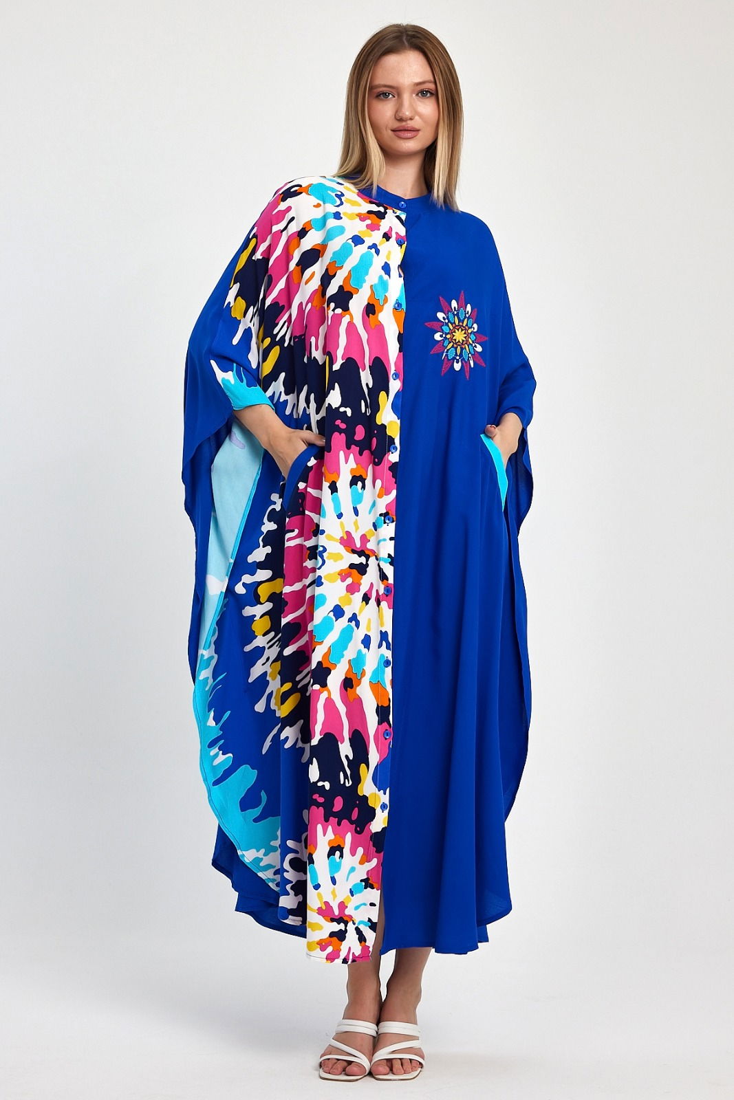 Rochie oversize, cu imprimeu si broderie in nunte de albastru, din vascoza
