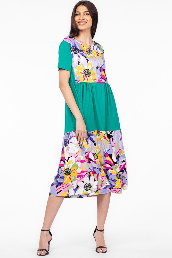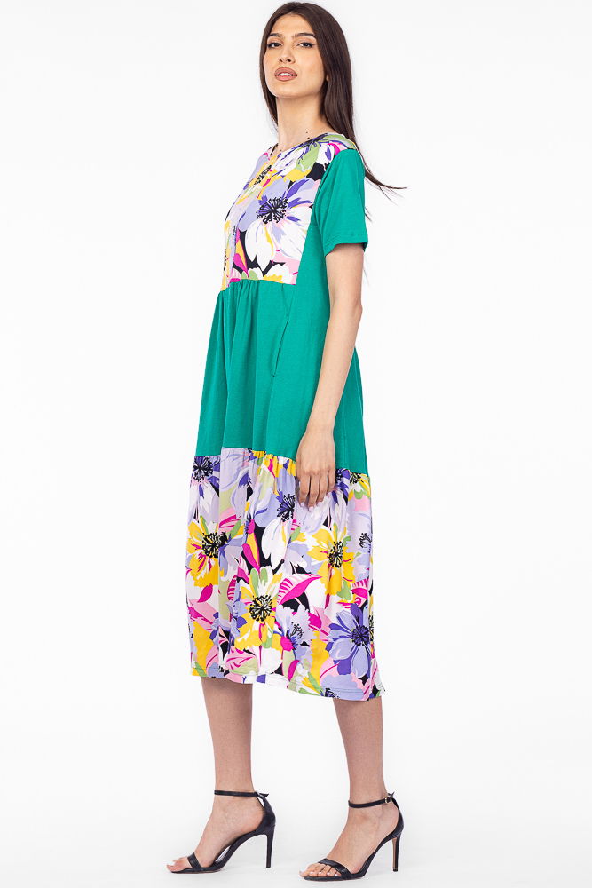 Pierino Rochie verde cu platca si doua volane, imprimeu flori mari, din bumbac