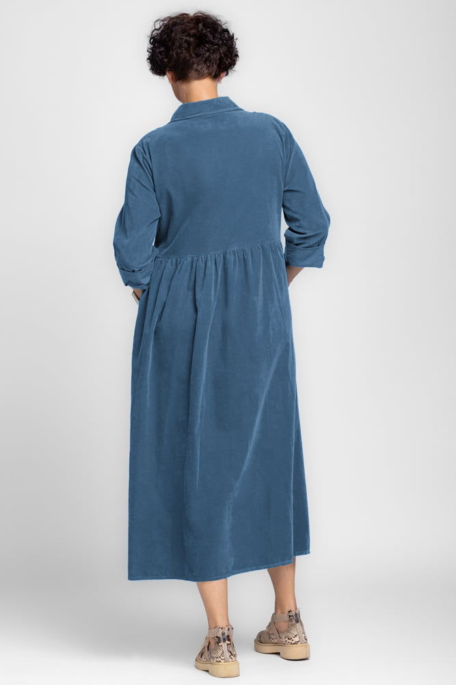 Shopika Rochie camasa albastru jeans din catifea reiata, taiata in talie