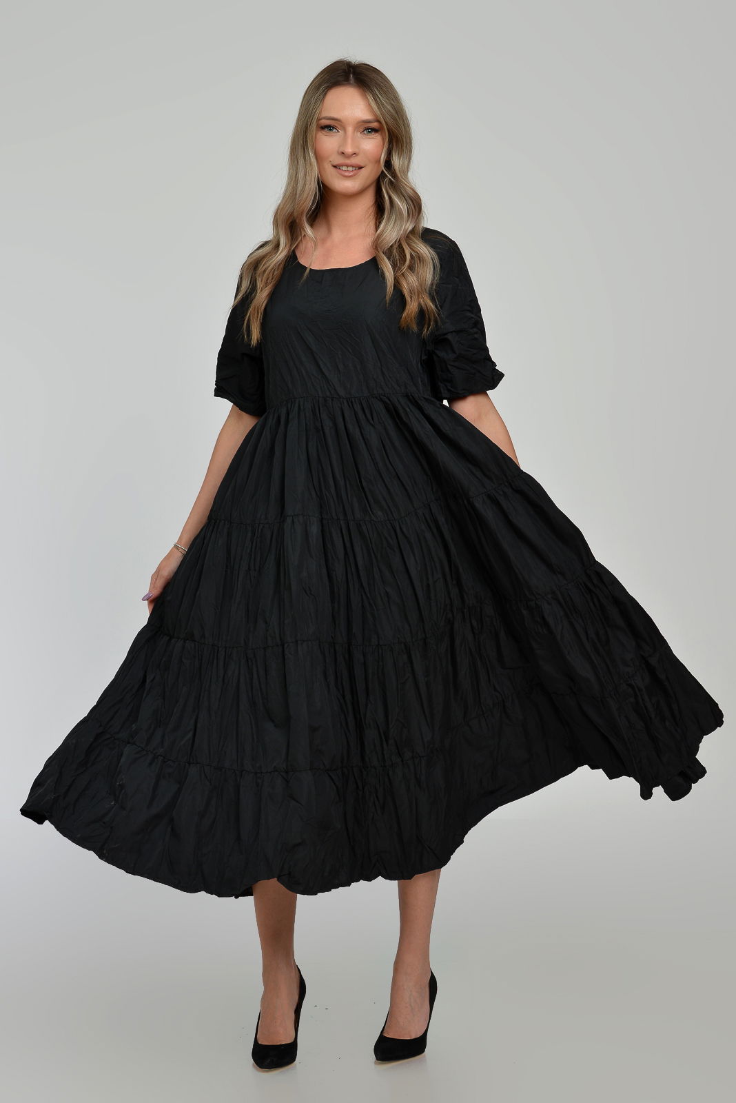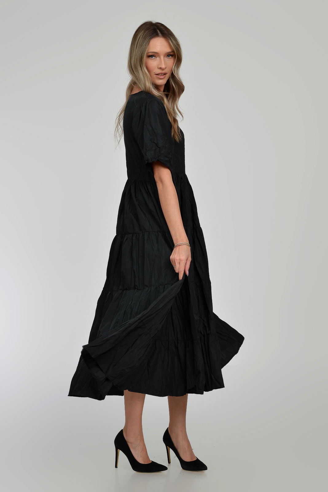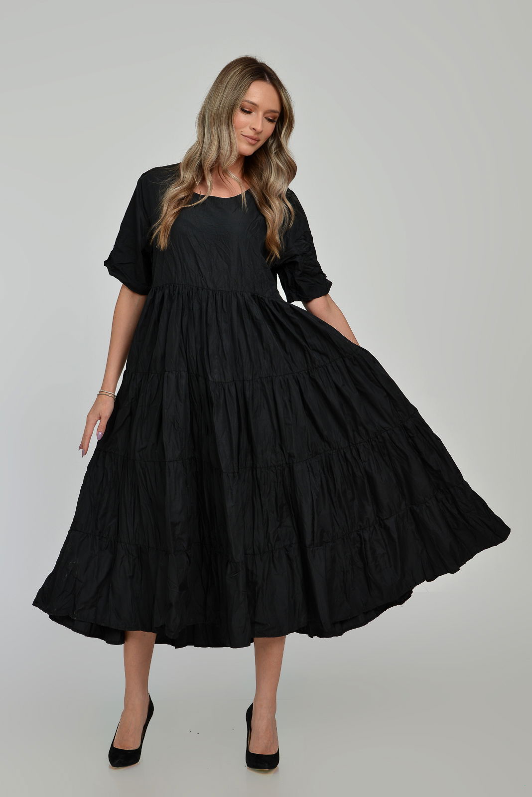 Shopika Romania Rochie ampla, lunga, cu volane, A-line, taiata in talie, din tafta de vascoza, neagra cu irizatii maron