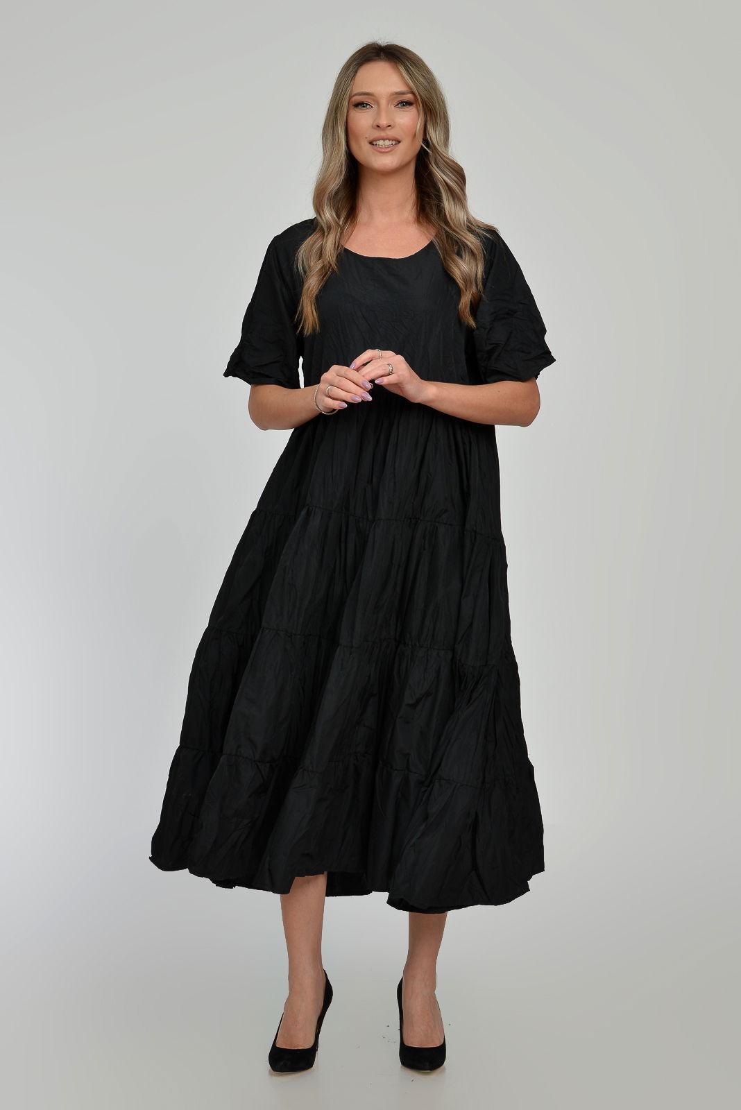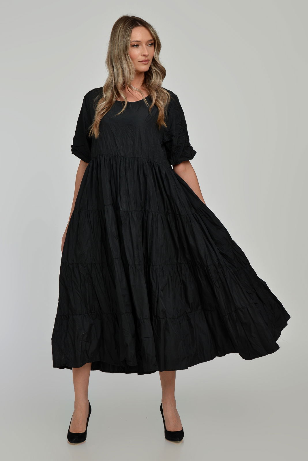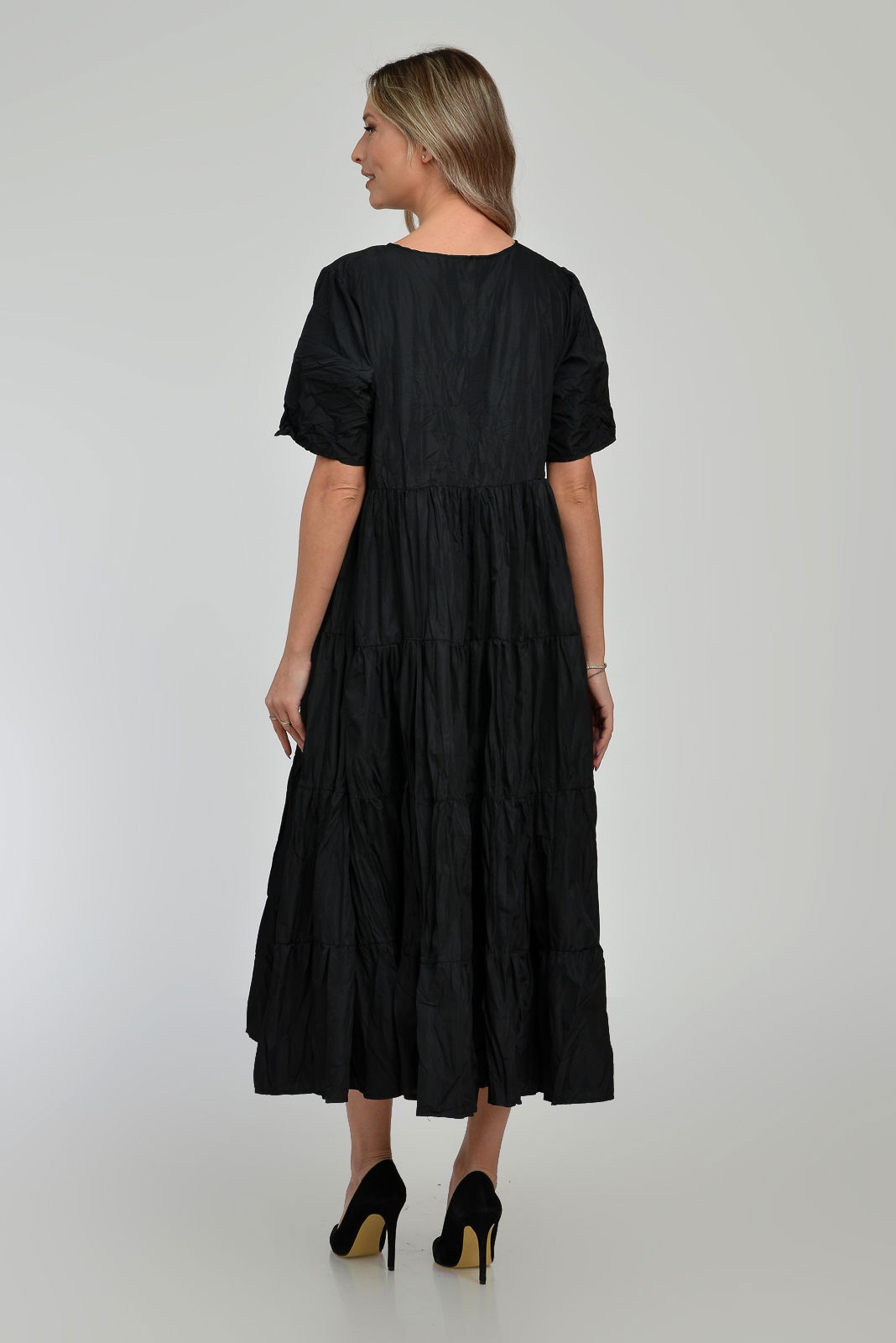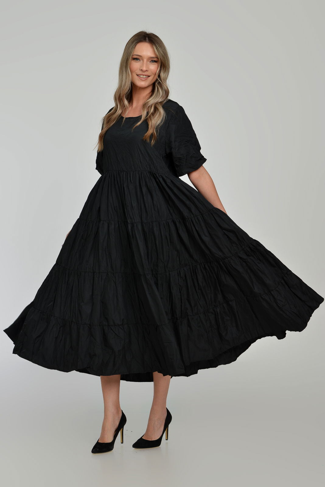 Shopika Romania Rochie ampla, lunga, cu volane, A-line, taiata in talie, din tafta de vascoza, neagra cu irizatii maron