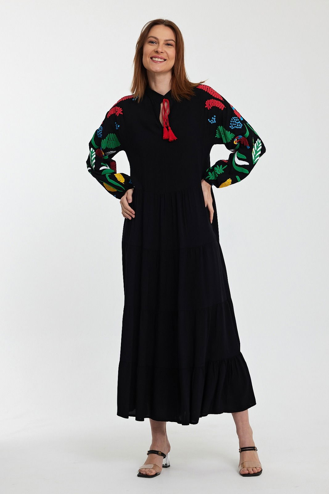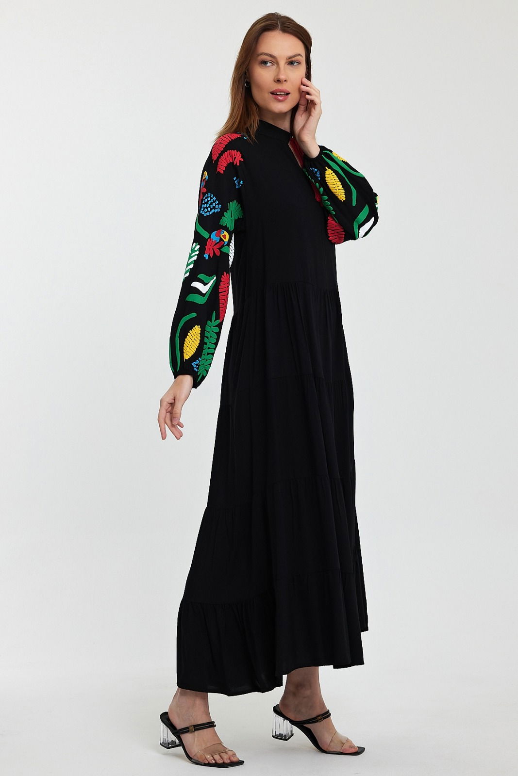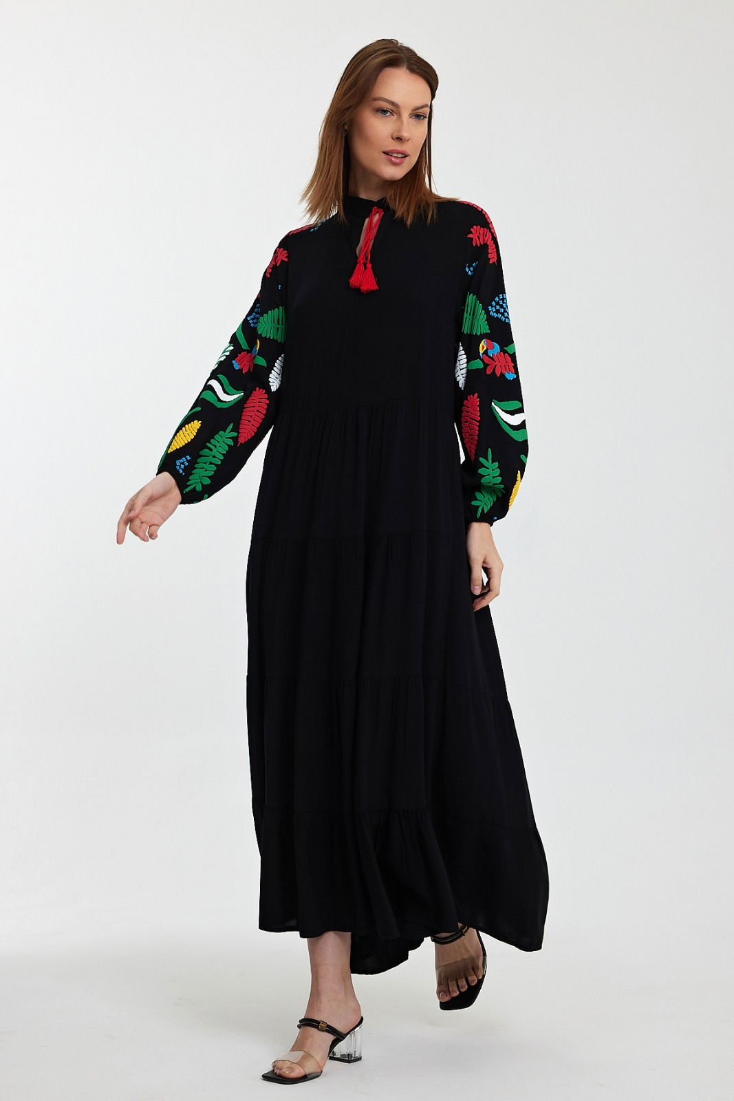 Rochie neagra cu imprimeu cauciucat cu papagali si maneci bufante, din vascoz