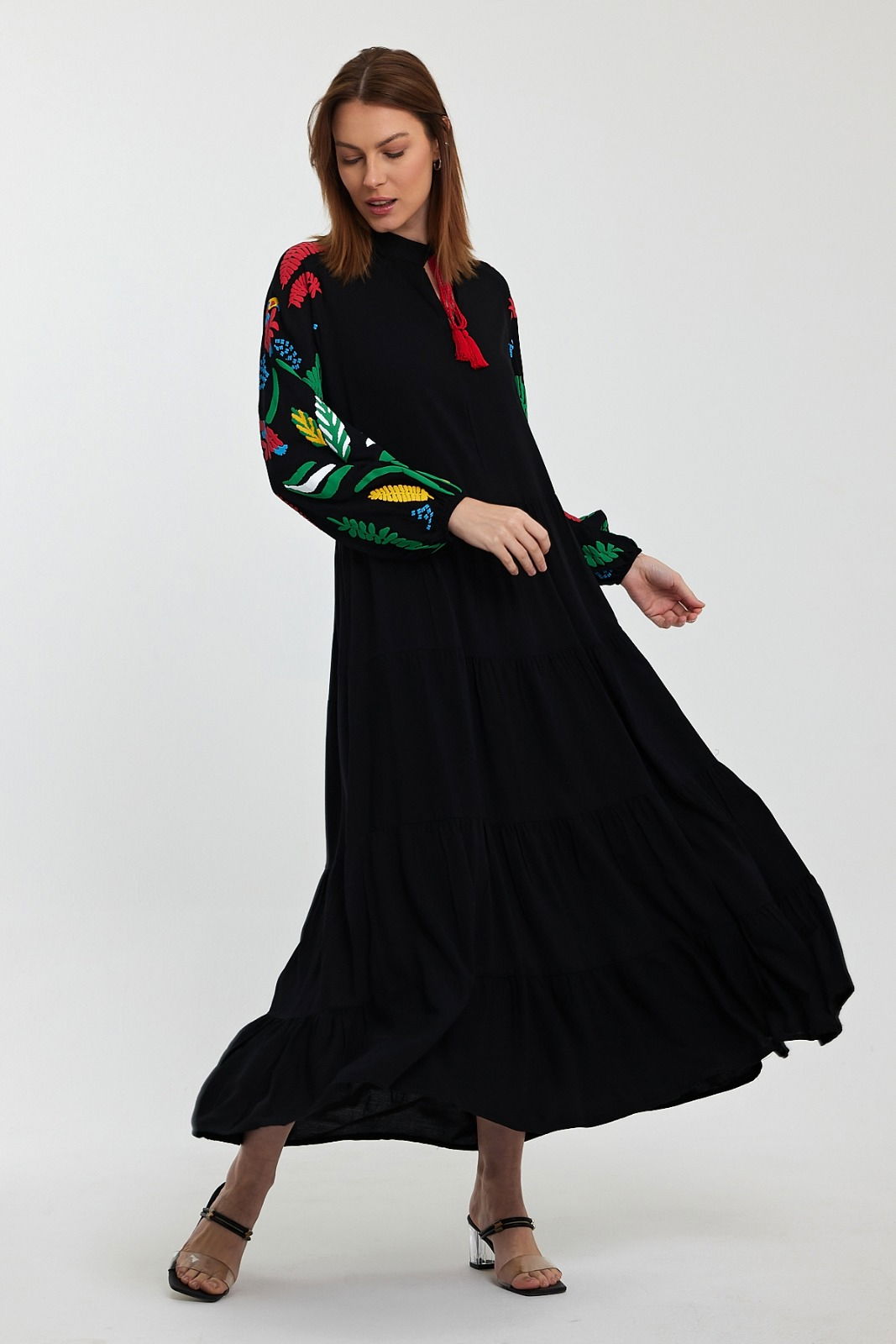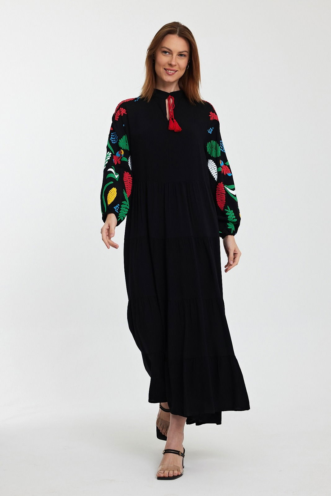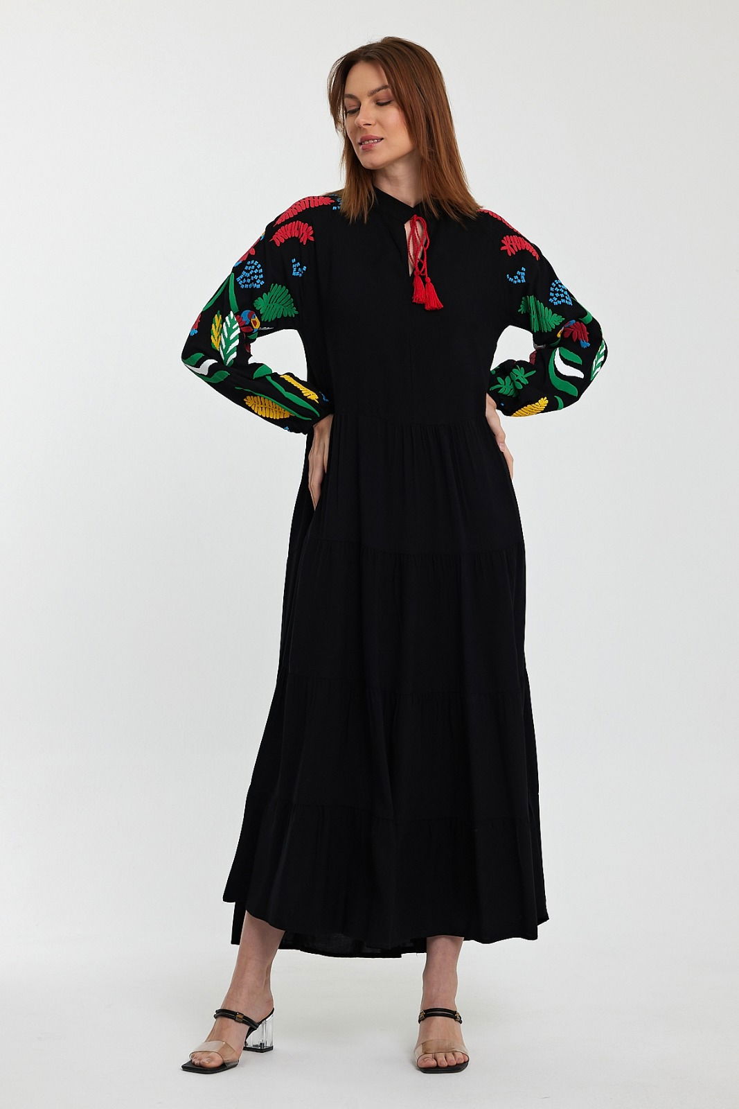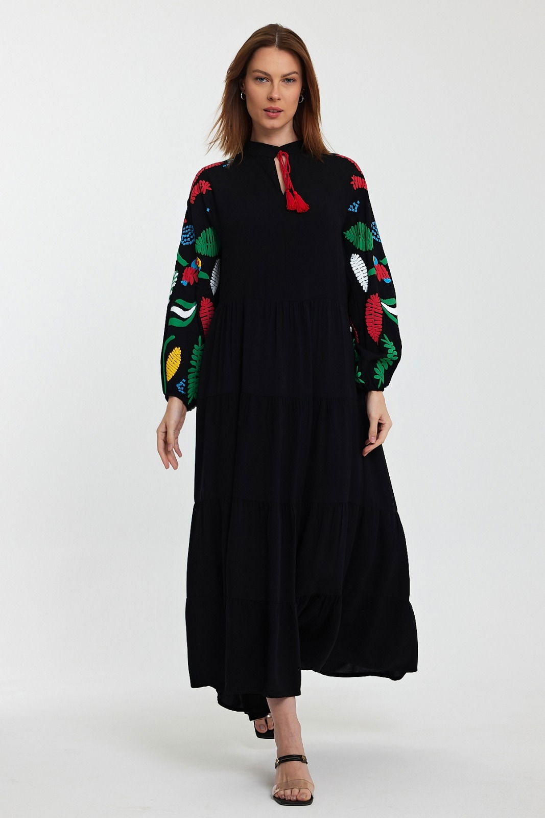 Rochie neagra cu imprimeu cauciucat cu papagali si maneci bufante, din vascoz