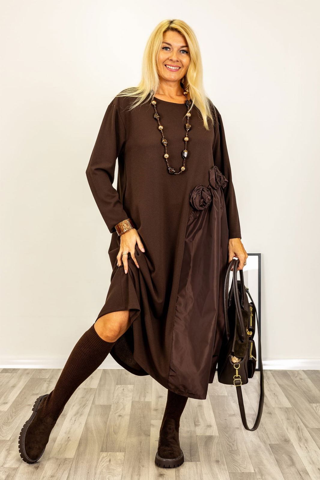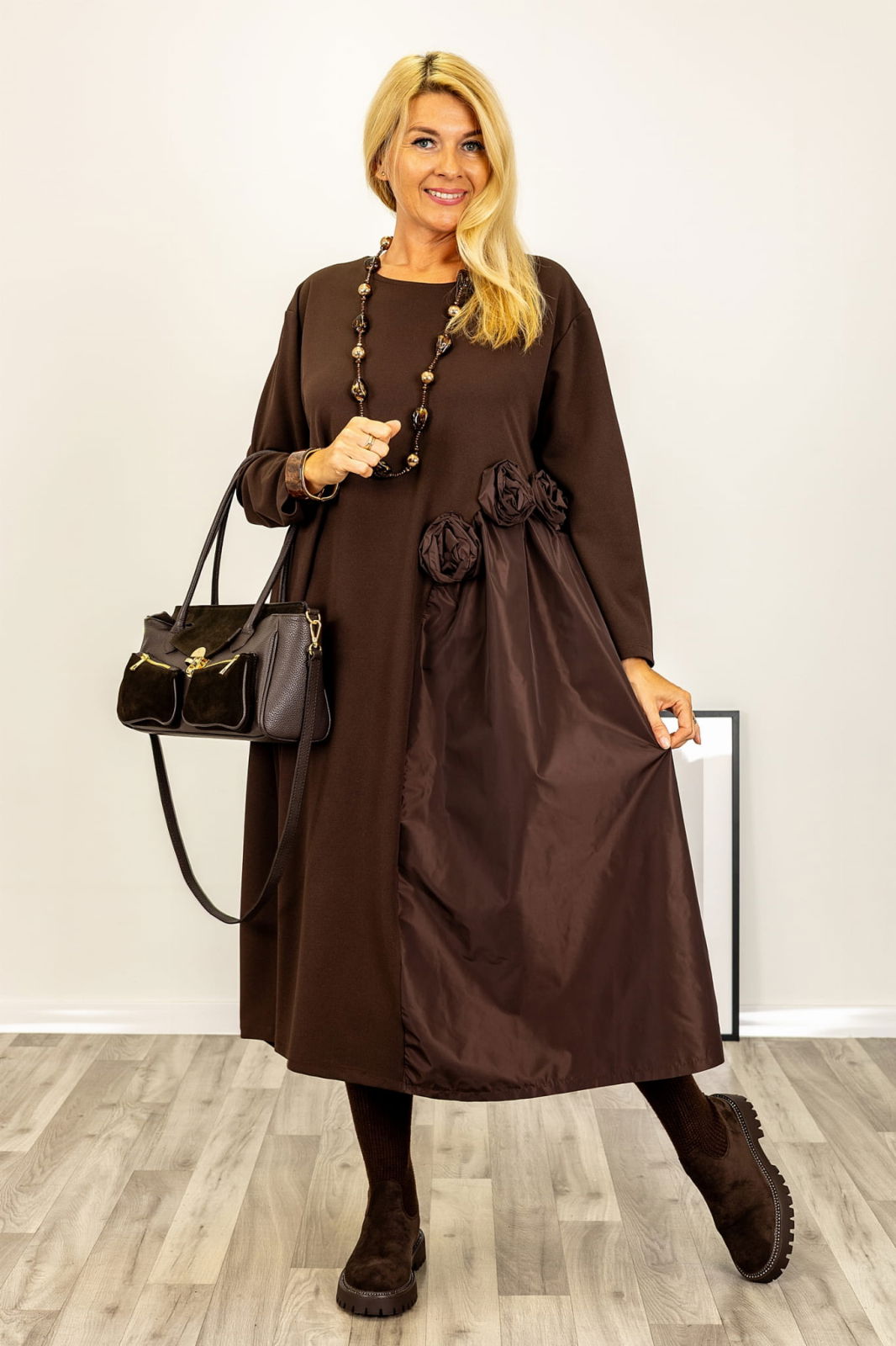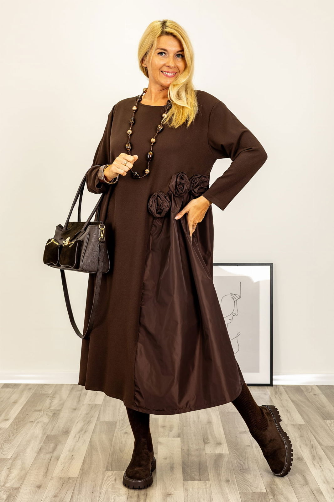 O rochie statement care îmbina eleganta moderna cu accente artistice. Silueta ampla, fluida, este sculptata dintr-un material compact, iar lateralul este decorat cu flori 3D si un panou satinat cu luciu discret, creand un contrast sofisticat. O piesa care atrage priviri prin minimalism luxuriant si detalii couture, perfecta pentru evenimente, aparitii de seara sau tinute casual-chic cu personalitate.