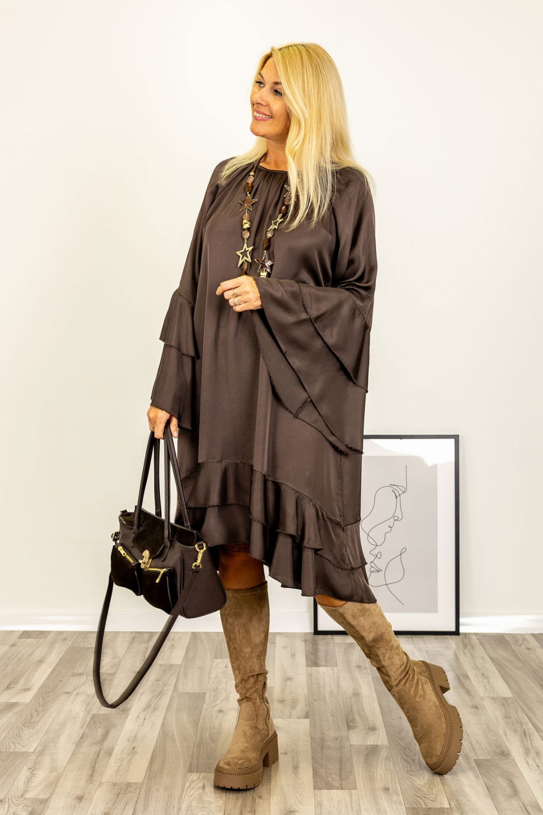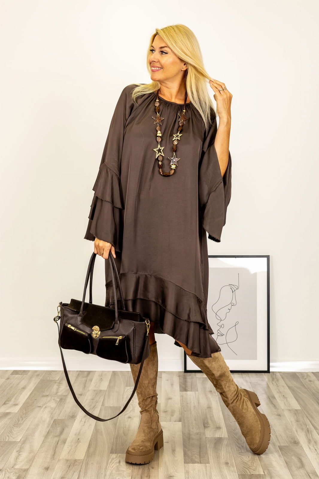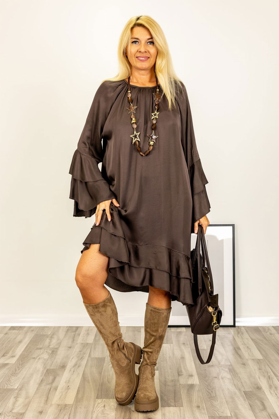 Shopika Rochie midi cu volane si maneci clopot, satinata, cu matase, maro