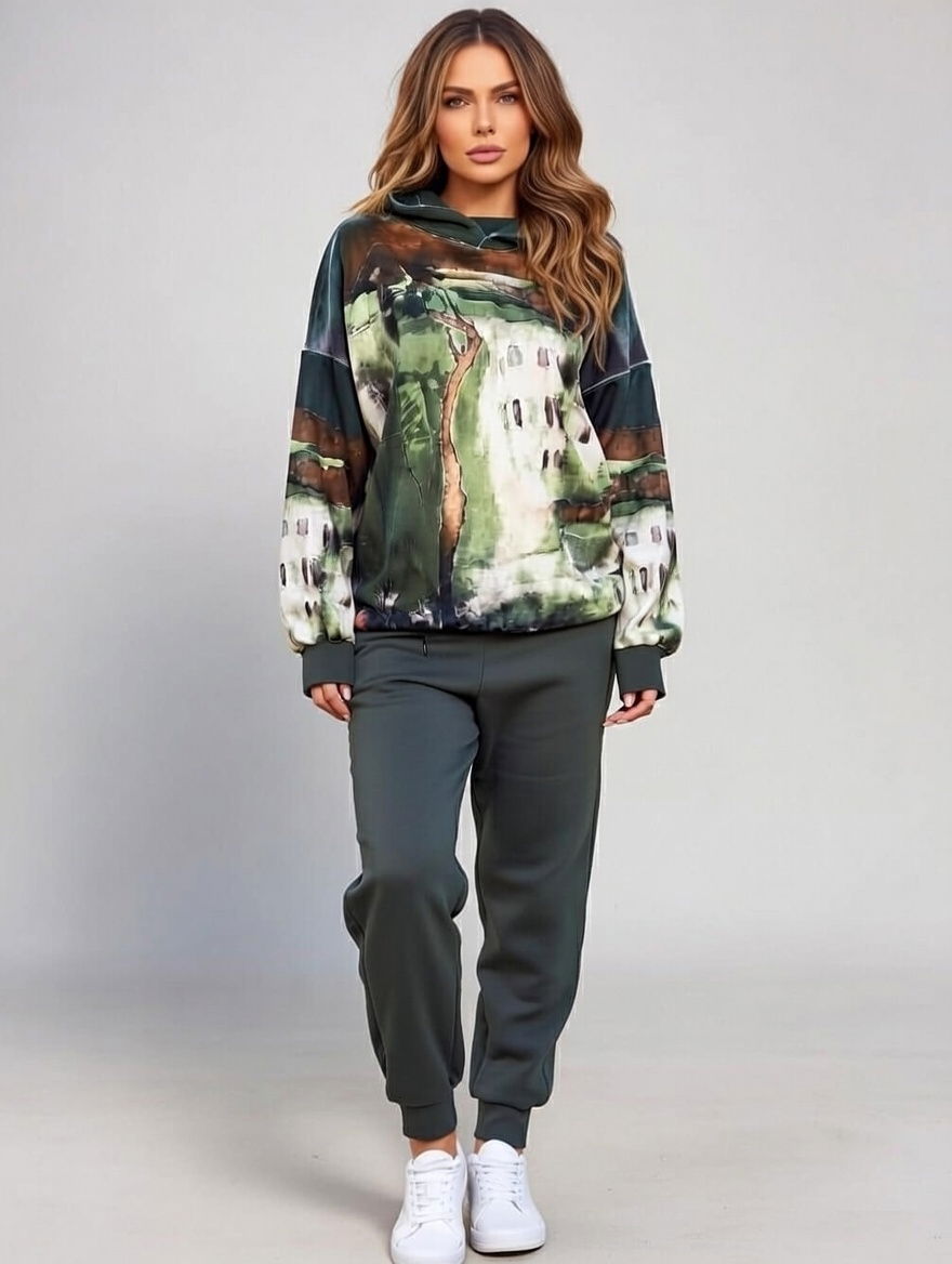 Hanoracul cu gluga si imprimeu artistic frontal adauga personalitate tinutei, in timp ce pantalonii jogger cu croi lejer asigura libertate de miscare si confort pe tot parcursul zilei. Textura fina a catifelei capteaza subtil lumina, oferind un look sofisticat, ideal atat pentru tinute casual, cat si pentru aparitii relaxate, dar stilizate.