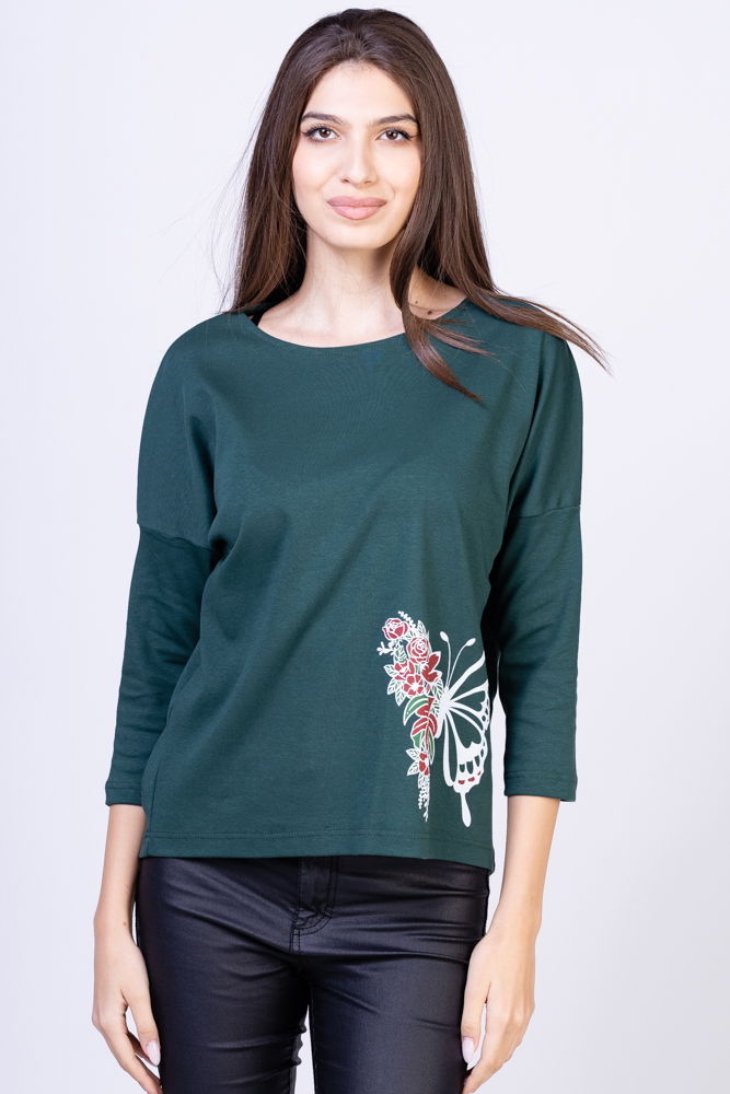 Pierino Tricou verde inchis din bumbac, cu maneci 3/4 si imprimeu fluture