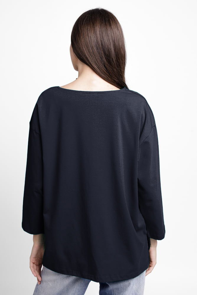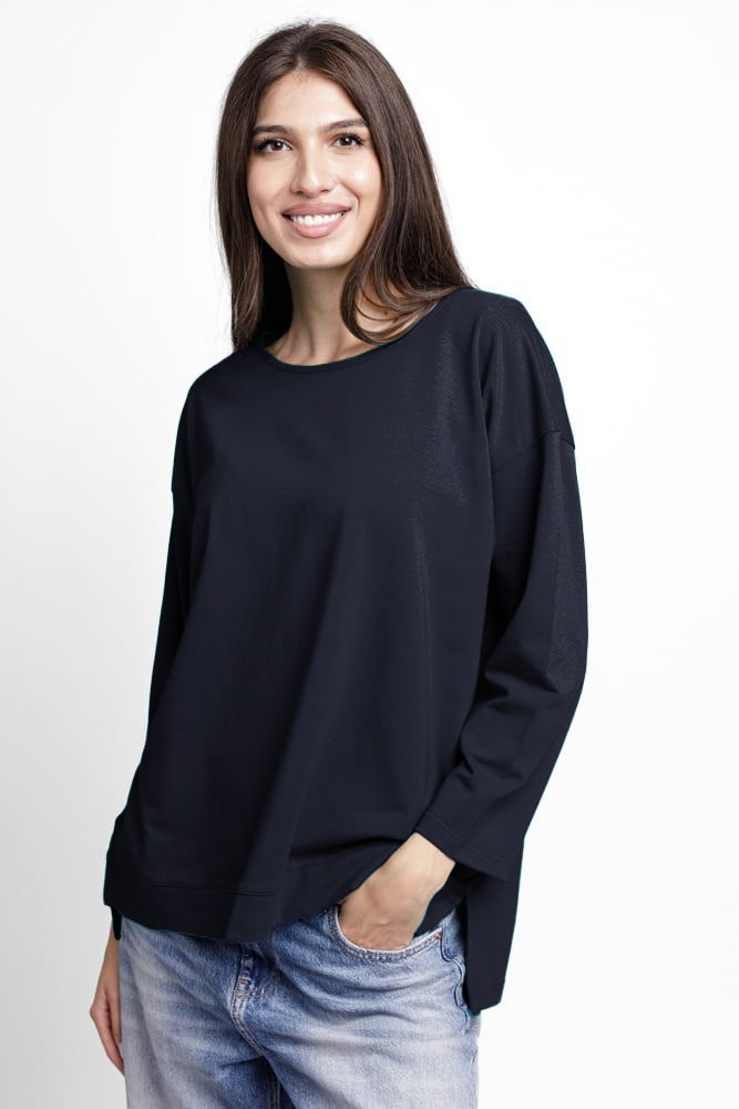 Bluza larga, dreapta, cu despicaturi laterale, din tricot de bumbac, belumarin inchis